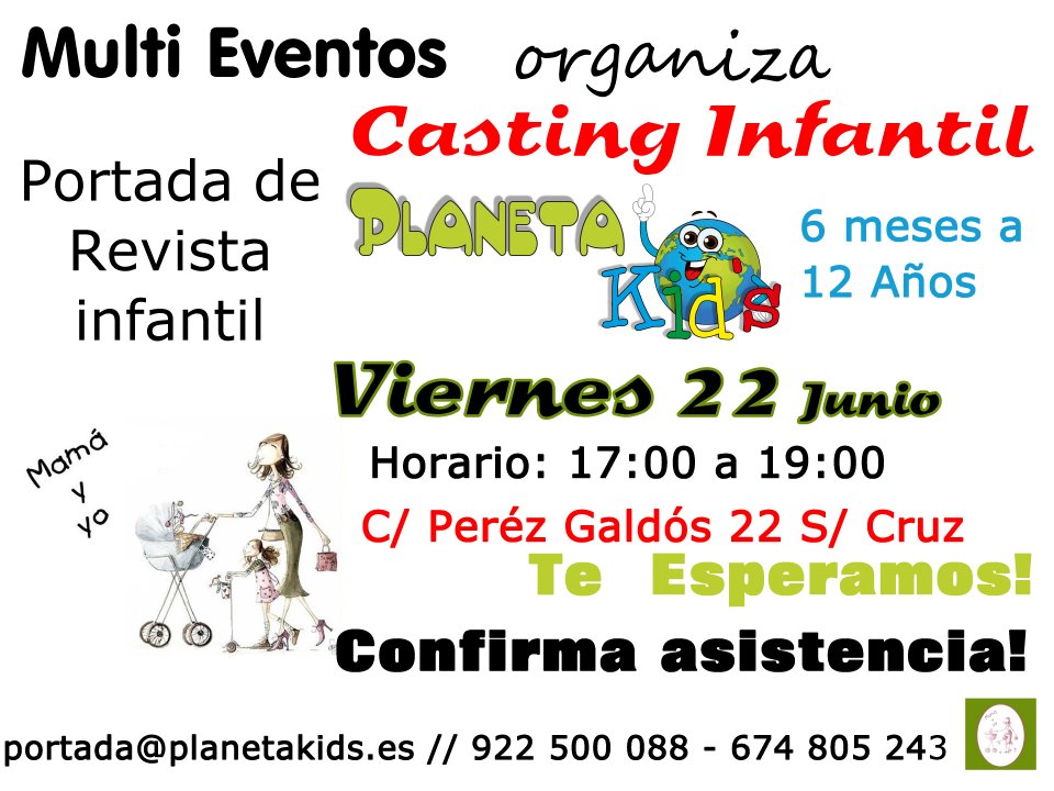 Multi Eventos llevará a cabo el próximo viernes 22 de junio, en la tienda de moda infantil Mamá y yo, un casting para elegir a los niños que protagonizarán la portada de los números de julio, agosto y septiembre de la revista Planeta Kids.